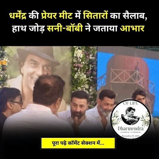 धर्मेंद्र की प्रेयर मीट में सितारों का सैलाब,हाथ जोड़ सनी-बॉबी ने जताया आभार।