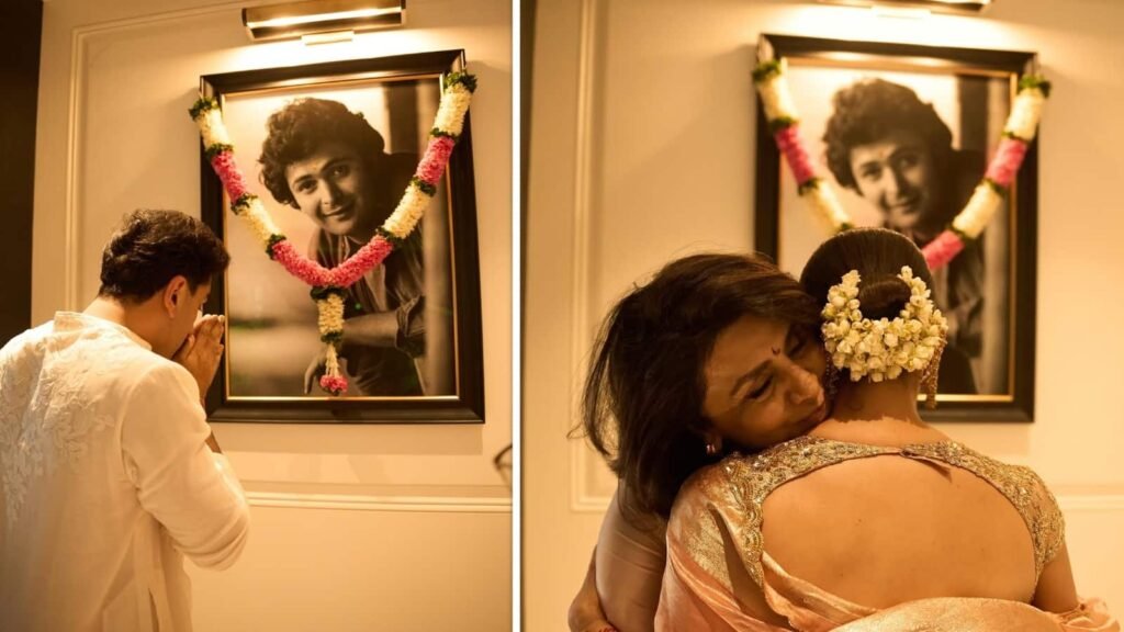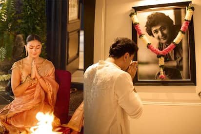इस तस्वीर में दोनों एक साथ अपने घर में एंट्री करते दिख रहे हैं। जहां दरवाजे पर अक्षत कलश भी रखा है। यहां आलिया हवन में बैठी है। तो इस फोटो में दोनों हवन में आहुति डालते दिख रहे हैं। रणबीर ने अपने इस घर को पापा ऋषि कपूर की खूबसूरत यादों से सजाया है। यह तस्वीर बेहद प्यारी है। ऋषि कपूर की बेहद खूबसूरत ब्लैक एंड वाइट फोटो फ्रेम के सामने रणबीर नजर आ रहे हैं। पापा को वह हाथ जोड़े प्रणाम कर रहे हैं। इस तस्वीर में नीतू कपूर का इमोशनल मोमेंट कैप्चर हुआ है जो पति को याद कर भावुक हो गई और आलिया के गले लग रो पड़ी। यह फोटो भी बेहद क्यूट है।
