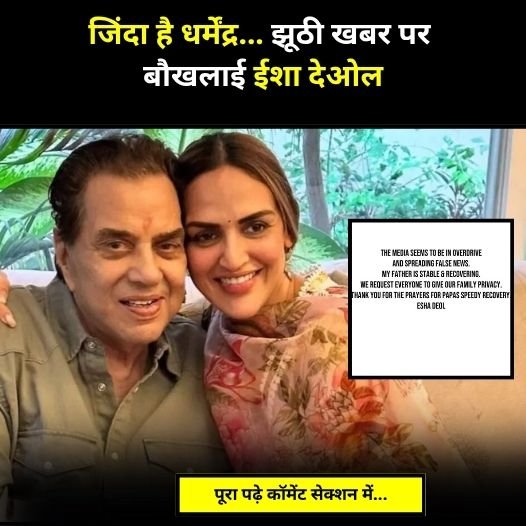 धर्मेंद्र जी जिंदा हैं। हम माफी मांगते हैं कि मीडिया में फैली गलत खबर का हम भी शिकार हो गए। खुद अभी चंद सेकंड पहले धर्मेंद्र की बेटी ईशा देओल ने नाराजगी जताते हुए बताया है कि धर्मेंद्र जी सही सलामत हैं और रिकवर कर रहे हैं।