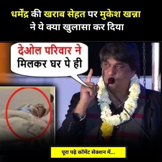 इस समय की सबसे बड़ी खबर सामने आ रही है जिसमें यह बताया जा रहा है कि मुकेश खन्ना ने धर्मेंद्र के सेहत में बिगड़ते हुए हालात को लेकर एक ऐसा बयान दे दिया है जिस बयान की चर्चाएं थमने का नाम नहीं ले रही हैं। जैसे कि आप सभी जानते हैं कि 89 साल के धर्मेंद्र अब हमारे बीच में नहीं रहे और करोड़ों लोगों की दिलों की धड़कन और करोड़ों प्रशंसकों के चहेते धर्मेंद्र के निधन ने पूरे फिल्म जगत को गहरे शोक में डुबो दिया था।