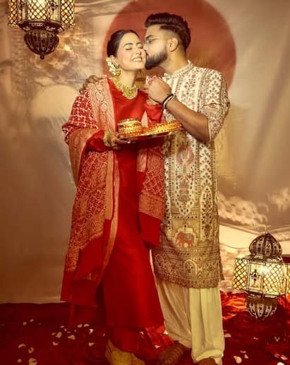 इन तस्वीरों को देखने के बाद फैंस ने भी अपने रिएक्शंस देने शुरू कर दिए हैं। लोग उन्हें ऐसे ही हंसते मुस्कुराते और सदा सौभाग्यवती सुहागन रहने का आशीर्वाद दे रहे हैं। इन तस्वीरों में आप देख सकते हैं कि किस तरह दोनों एक दूसरे पर प्यार लुटाते हुए नजर आ रहे हैं। बता दें कि सिर्फ हिना ही नहीं टीवी की बाकी बहुएं भी दुल्हन सी सजी नजर आई। दूसरी बार मां बन रही भारती सिंह ने भी करवा चौथ का व्रत रखा जिसकी झलक उन्होंने सोशल मीडिया पर भी दिखाई। वहीं दूसरी बार मां बन रही भारती सिंह भी पिंक कलर के बनारसी सिल्क साड़ी और महाराष्ट्रियन लुक में खूब जच रही थी। वहीं टीवी की पॉपुलर नागिन एक्ट्रेस सुरभि ज्योति ने अपना पहला करवा चौथ रोमांटिक तरीके से मनाया। सुरभि ज्योति ने इस खास मौके पर ऑरेंज कलर का डिजाइनर सूट पहना और उसके साथ उन्होंने माथे पर छोटी सी बिंदी और मांग में सिंदूर लगाया।