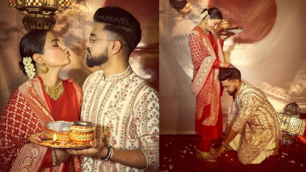 मांग में सिंदूर बालों में गजरा हाथों में सजाई रॉकी के नाम की मेहंदी माथे पर लगाई लाल बिंदी सुर्ख लाल जोड़े में दुल्हन सी सजी हिना खान पहले करवा चौथ पर लाल इश्क में डूबे रॉकी और हिना धर्म की बेड़ियों को तोड़ पति की लंबी उम्र के लिए टीवी की अक्षरा ने रखा व्रत रॉकी ने छुए बीवी के पैर देवी का दिया दर्जा या यूं कहे कि शिव शिव शक्ति का हुआ मिलन।