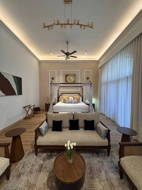 गौर करने वाली बात यह है कि पावरफुल कपल के इस खूबसूरत विला में वन नाइट स्टे का चार्ज ₹75,000 है। जैसा कि आप तस्वीर में देख सकते हैं कि विला में एंट्री करते ही सबसे पहले आपका वेलकम एक बड़े से स्विमिंग पूल से होता है। यह विला स्विमिंग पूल के चारों ओर खास तरीके से बना हुआ है। सिंघम एक्टर के इस विला की सबसे खास बात है कि इसमें पांच बेडरूम है और हर एक मास्टर बैडरूम का डिजाइन अलग-अलग डिजाइन किया गया है। तस्वीर में आप यह भी देख सकते हैं कि महल जैसे शाही बेडरूम में लकड़ी का बेड और सोफे भी बने हुए हैं। ऑफ वाइट थीम पर बना यह बेडरूम और विला क्लासी और रियलिटी का टच भी देता है।