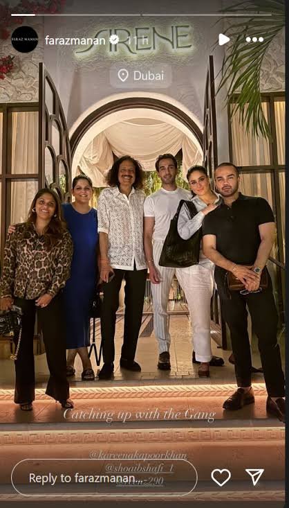 वहीं दूसरी तरफ हमारी करीना कपूर दुबई में एक पाकिस्तानी आर्टिस्ट के साथ पोस्ट करती नजर आई करीना कपूर इस वक्त दुबई में है और वहां पर उन्होंने मुलाकात की पाकिस्तानी फैशन डिजाइनर फराज मैनन के साथ फराज मैनन ने अपने इंस्टाग्राम स्टोरी में दो पिक्चर्स डाली है जिसमें एक ग्रुप फोटो है इस ग्रुप फोटो में भी करीना कपूर फराज के साथ कंधे पर हाथ रखे हुए नजर आ रही है और दूसरी उन्होंने फराज के साथ सिंगल पिक्चर क्लिक करवाई है।