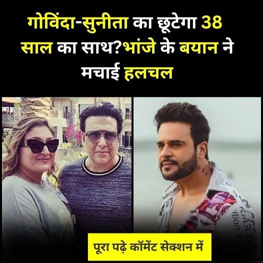 गोविंदा और सुनीता के रिश्ते में आई दरार। खत्म हो सकता है 38 साल का रिश्ता। बीवी ने लगाया अफेयर का इल्जाम। दांव पर लगाया खुशहाल घर। खबरों पर भांजे ने तोड़ी चुप्पी। कह डाली मामा के दिल की बात। रिश्ते पर मामा-मामी को दी ऐसी सलाह। जी हां, गोविंदा के परिवार में इस वक्त हाई वोल्टेज ड्रामा चल रहा है। एक तरफ सुनीता आहूजा पति गोविंदा पर अफेयर का आरोप लगा रही हैं, तो दूसरी तरफ गोविंदा इन आरोपों को दुश्मनों की साजिश बता रहे हैं।