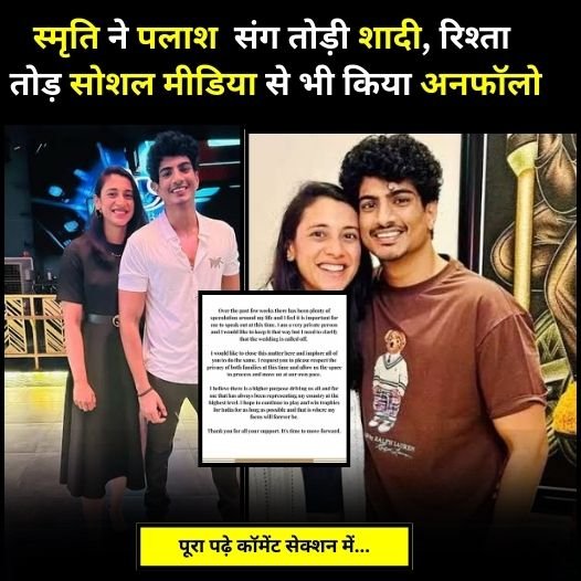 वह लिखती हैं कि मेरा विश्वास है कि हम सभी को एक उच्च उद्देश्य आगे बढ़ाता है और मेरे लिए वह हमेशा अपने देश का सर्वोच्च स्तर पर प्रतिनिधित्व करना रहा है। मैं आगे भी भारत के लिए खेलना चाहती हूं। ट्रॉफियां जीतना चाहती हूं और यही मेरे ध्यान का केंद्र रहेगा। बता दें कि स्मृति मंधाना ने शादी टूटने का ऐलान करने के साथ ही अपने एक्स मंगेतर और सिंगर पलाश मुच्छल को सोशल मीडिया से भी अनफॉलो कर दिया है। स्मृति का यह पोस्ट जैसे ही सामने आया, सोशल मीडिया पर रिएशंस की बाढ़ आ गई। अपने पोस्ट में स्मृति ने कहीं भी शादी टूटने की वजह नहीं बताई है। लेकिन नेटिजंस अलग-अलग कयास लगा रहे हैं और इस रिश्ते के टूटने की वजह पलाश का धोखा बता रहे हैं। लोगों का कहना है कि अभी तक जो खबरें आ रही थी कहीं ना कहीं वह सही थी।