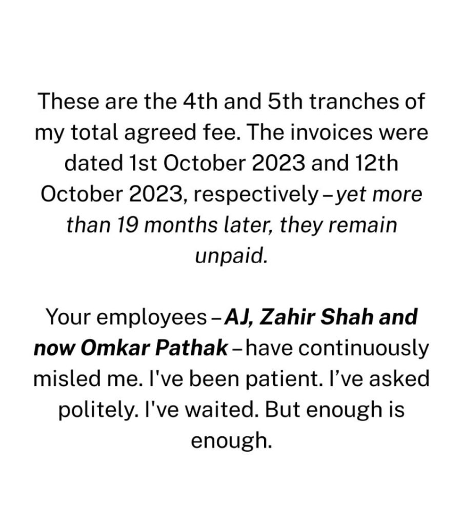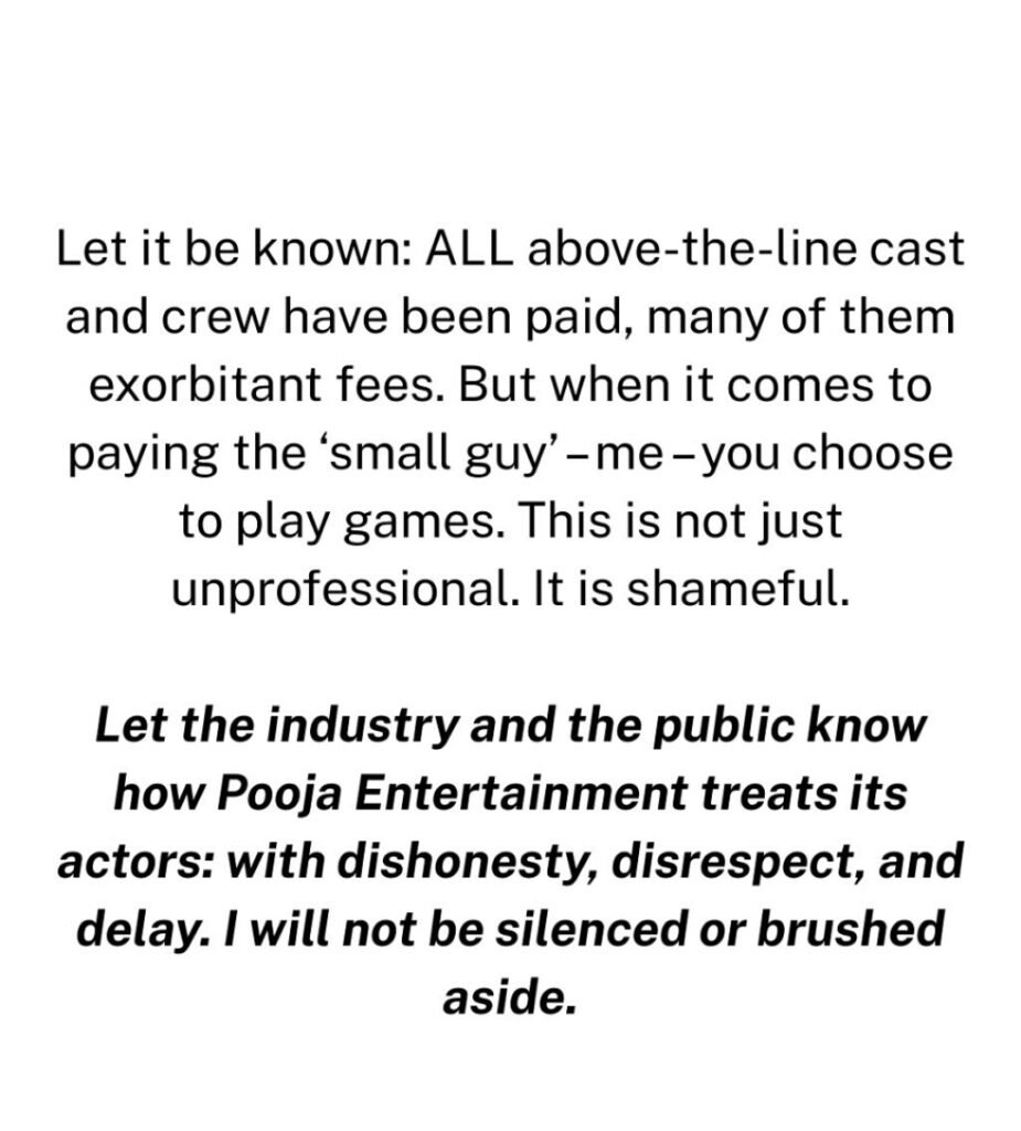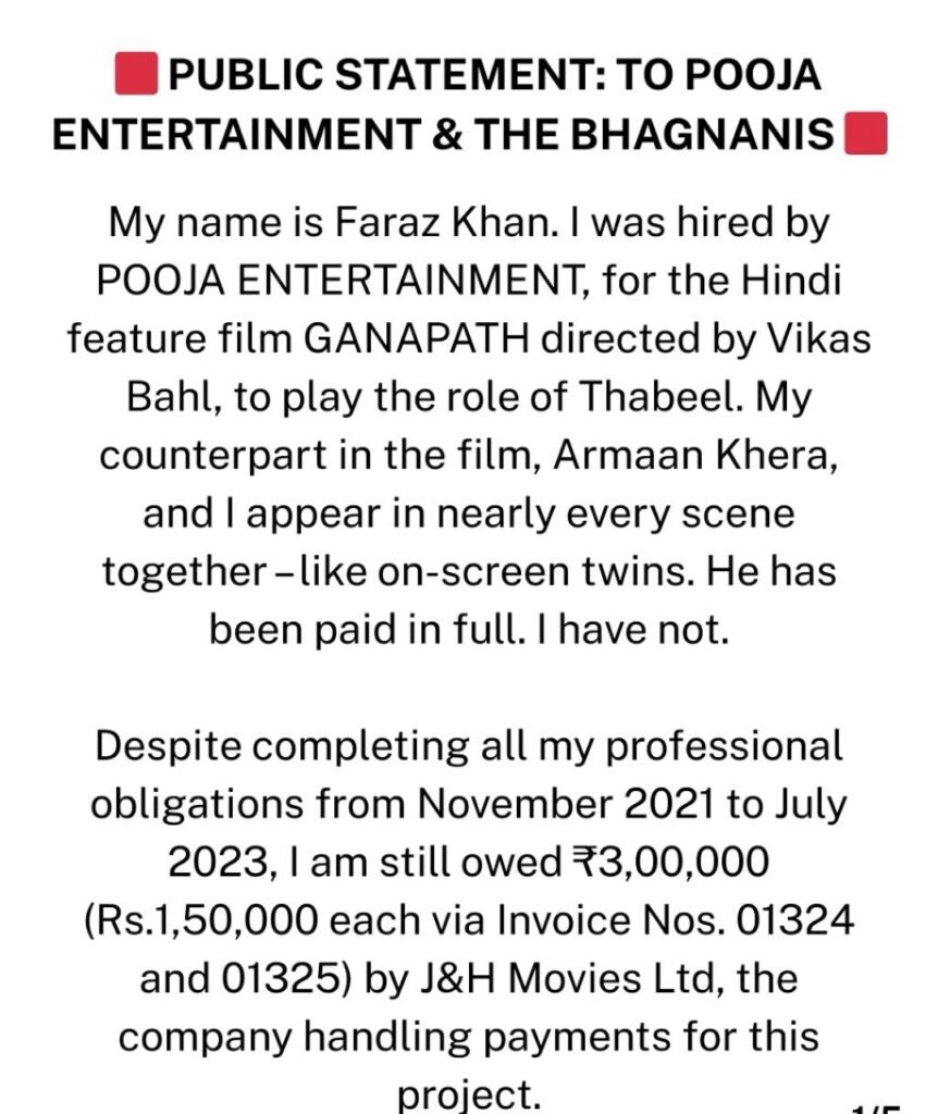 एक्टर फराज खान ने आज पूजा एंटरटेनमेंट के नाम एक पोस्ट लिखी है जिसमें उन्होंने कहा है कि उन्होंने गणपत फिल्म में शूट किया था उनके सीन्स भी फिल्म में हैं इसके बावजूद उन्हें अपनी फीस आज तक नहीं मिली है ₹3 लाख वो आज भी पूजा एंटरटेनमेंट से मांगते हैं फराज ने बताया कि जब भी यह पूजा एंटरटेनमेंट के पास अपना पैसा मांगने गए तो पूजा एंटरटेनमेंट की तरफ से एक नया बंदा सामने कर दिया गया जो हर बार फराज को एक नई डेट देता है इसमें एजे जाहिर शाह और अब नया बंदा ओमकार है जो टालमटोल कर रहा है उनकी पेमेंट के लिए फराज ने क्लियरली कह दिया है कि अब बहुत हो चुका है मैं बहुत भुगत चुका हूं मेरे साथ बदतमीजी भी बहुत हुई है आप मेरी पेमेंट क्लियर कर दीजिए नहीं तो मैं आपके खिलाफ तीन एक्शन लूंगा पहला तो लीगल नोटिस आपको भिजवाऊंगा दूसरा मैं मीडिया में आपके बारे में बात करूंगा और आप लोगों को एक्सपोज करूंगा किस तरह से आपने मेरी पेमेंट रोकी और तो और सोशल मीडिया पर जितने भी प्लेटफॉर्म्स हैं वहां पर मैं आपके साथ काम किए हुए खराब एक्सपीरियंस के बारे में बात करता रहूंगा और अपने पेमेंट की आवाज उठाता रहूंगा.