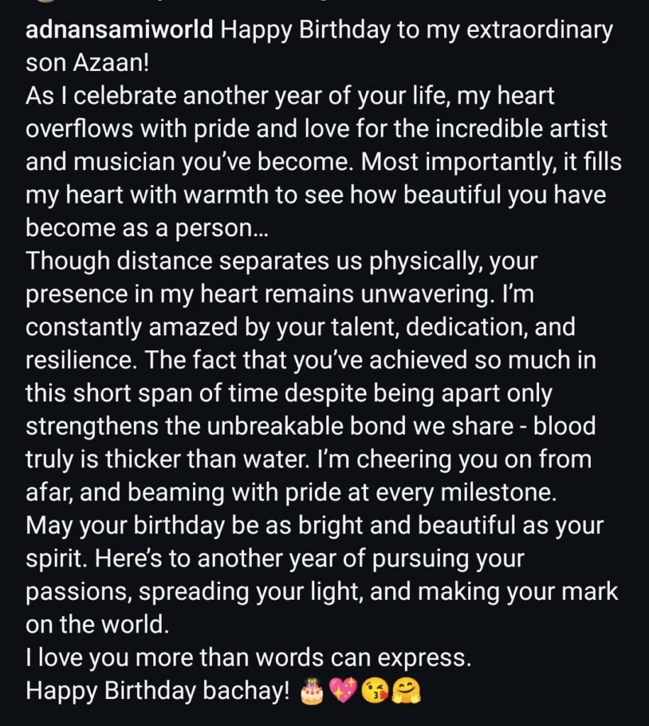 हाल ही में उनके बड़े बेटे अजान सामी का जन्मदिन था इस जन्मदिन पर बाप बेटे एक दूसरे से दूर थे क्योंकि जहां पिता अदनान भारतीय बन गए हैं तो वहीं बेटा पाकिस्तान में है भारतपाकि बीच खटास का असर बाप बेटे के रिश्ते पर पड़ रहा है अदनान ने अपने पाकिस्तानी बेटे को जन्मदिन की बधाइयां instagram पोस्ट के जरिए दी उन्होंने अपने इमोशनल पोस्ट में लिखा मेरे बहुत ही खास बेटे अजान को जन्मदिन की शुभकामनाएं आज जब मैं तुम्हारी जिंदगी का एक और साल देख रहा हूं मेरे दिल तुम्हारे कलाकार और संगीतकार बनने पर गर्व से भर गया है सबसे ज्यादा खुशी इस बात की है कि तुम इंसान के तौर पर कितने अच्छे बनते जा रहे हो हालांकि शारीरिक रूप से दूरी हमें अलग करती है लेकिन मेरे दिल में तुम्हारी मौजूदगी अटूट है मैं तुम्हारी प्रतिभा समर्पण और लचीलेपन से लगातार चकित हूं यह तथ्य कि तुमने अलग होने के बावजूद इस छोटे से समय में इतना सब कुछ हासिल किया हमारे बीच के अटूट बंधन को और मजबूत करता है वास्तव में पानी से गाढ़ा होता है.