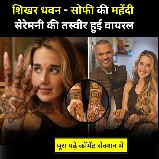 हाल ही में सोफी शाइन ने एक फोटो शेयर की जिसमें वह शायद अपने होने वाले पति शिखर धवन को देखते हुए नजर आ रही थी और हाथों पर लगी ताजा मेहंदी फ्लोंट कर रही थी। फोटो पर उन्होंने कैप्शन में लिखा वर्क इन प्रोग्रेस। इसके बाद उन्होंने अपने साथ कुछ और फोटोस भी शेयर की हैं। इन फोटो में आप देख सकते हैं कि सोफी अपनी मेहंदी सेरेमनी पर ब्लैक कलर के आउटफिट में दिखाई दे रही हैं। उन्होंने ब्लैक कलर की ट्राउज़ पहना है। इसके साथ ही उन्होंने ब्लैक कलर का एक टॉप पहना है। वहीं शिखर धवन भी लोअर और टीशर्ट में नजर आए।उन्होंने भी अपने हाथ पर मेहंदी लगाई है जिसमें उन्होंने एक शिवलिंग बनवाया हुआ है। वहीं इससे एक दिन पहले सोफी शाइन और शिखर धवन ने अपने संगीत नाइट की फोटो शेयर की थी।