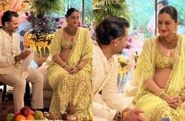 आंखों में कजरा, बालों में गजरा, चेहरे पर छाया नूर। अपनी गोद भराई में अप्सरा सी खूबसूरत दिखे मॉम डूबी सोनम कपूर। आहूजा और कपूर परिवार में हो रहा है नन्हे मुन्ने के आने का शिद्दत से इंतजार, गोद भराई में मॉम डूबी सोनम पर लुटाया गया ढेरों प्यार। लाइम ग्रीन लहंगे में सोनम का रूप खूब चमका। तो बीवी की गोद भराई में आनंद ने लगाया रोमांस का तड़का।