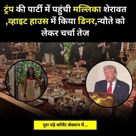 ट्रंप की पार्टी में पहुंची मल्लिका शेरावत। वाइट हाउस में हुई पार्टी की दिखाई झलक। मिस्टर ट्रंप के साथ एक्ट्रेस ने किया क्रिसमस डिनर। तो वायरल तस्वीरें देख सोशल मीडिया यूजर के साथ-साथ सेलेट्स की भी उड़े होश। वाइट हाउस में एंट्री से लेकर यूएस प्रेसिडेंट संग खास रिश्ते की शुरू हुई चर्चा। लोगों ने पूछा कैसे मिला वाइट हाउस से न्योता।